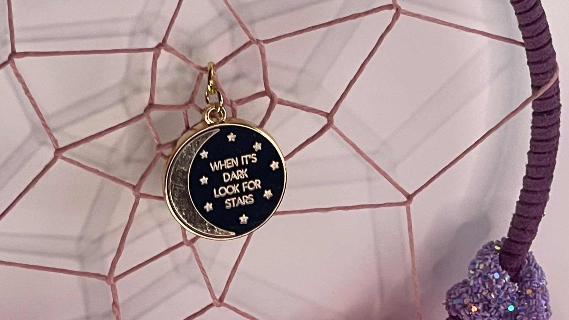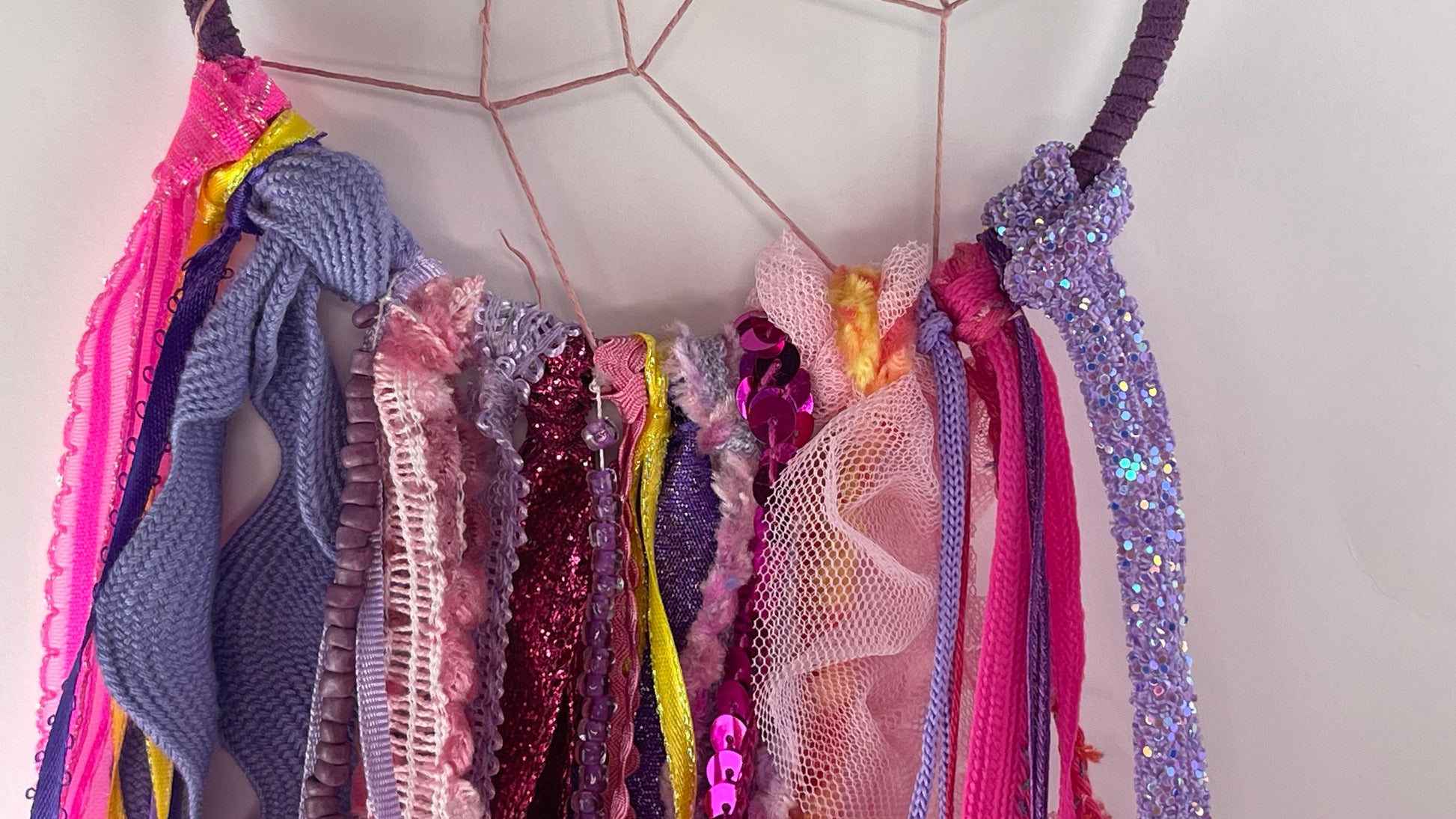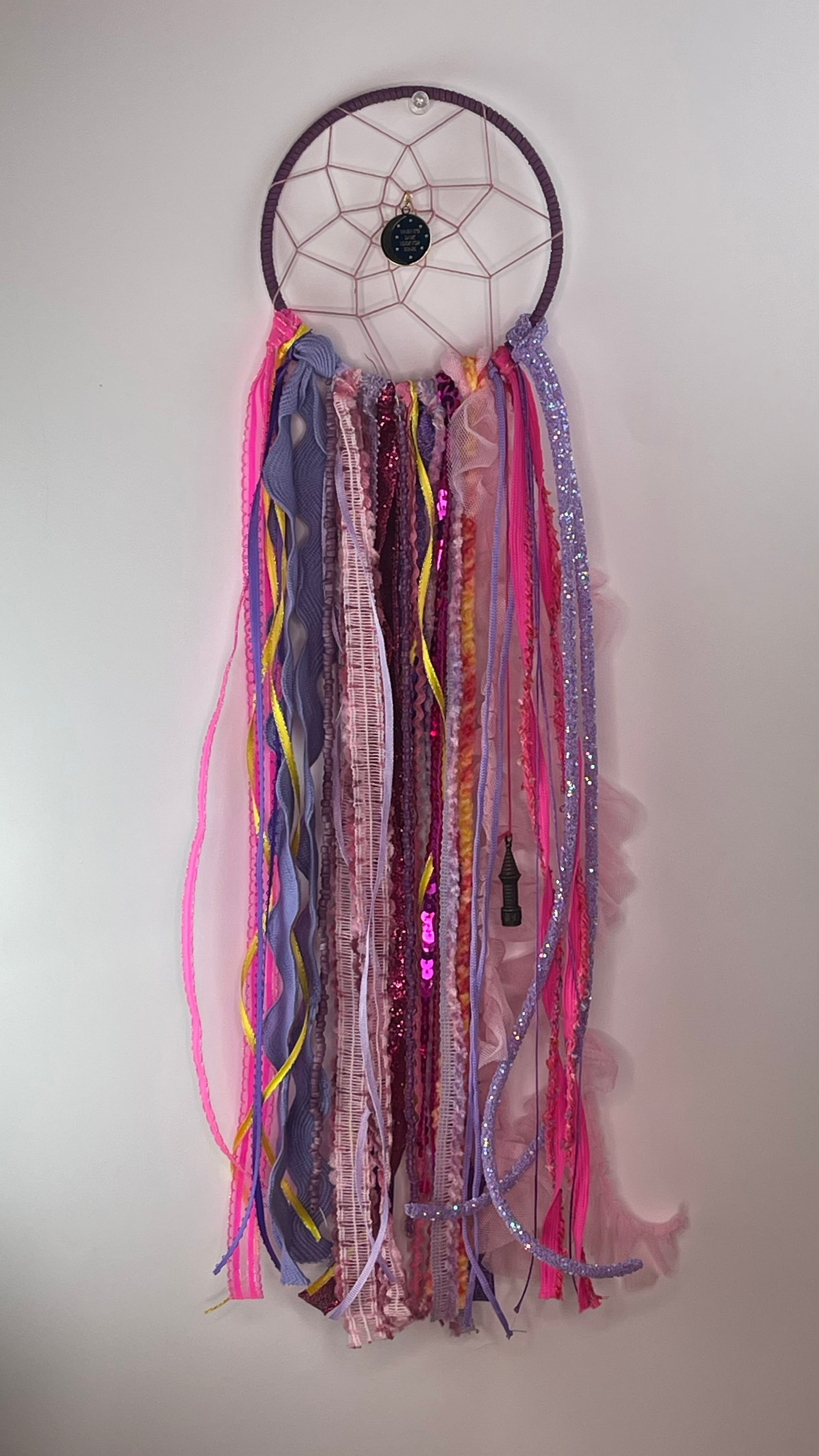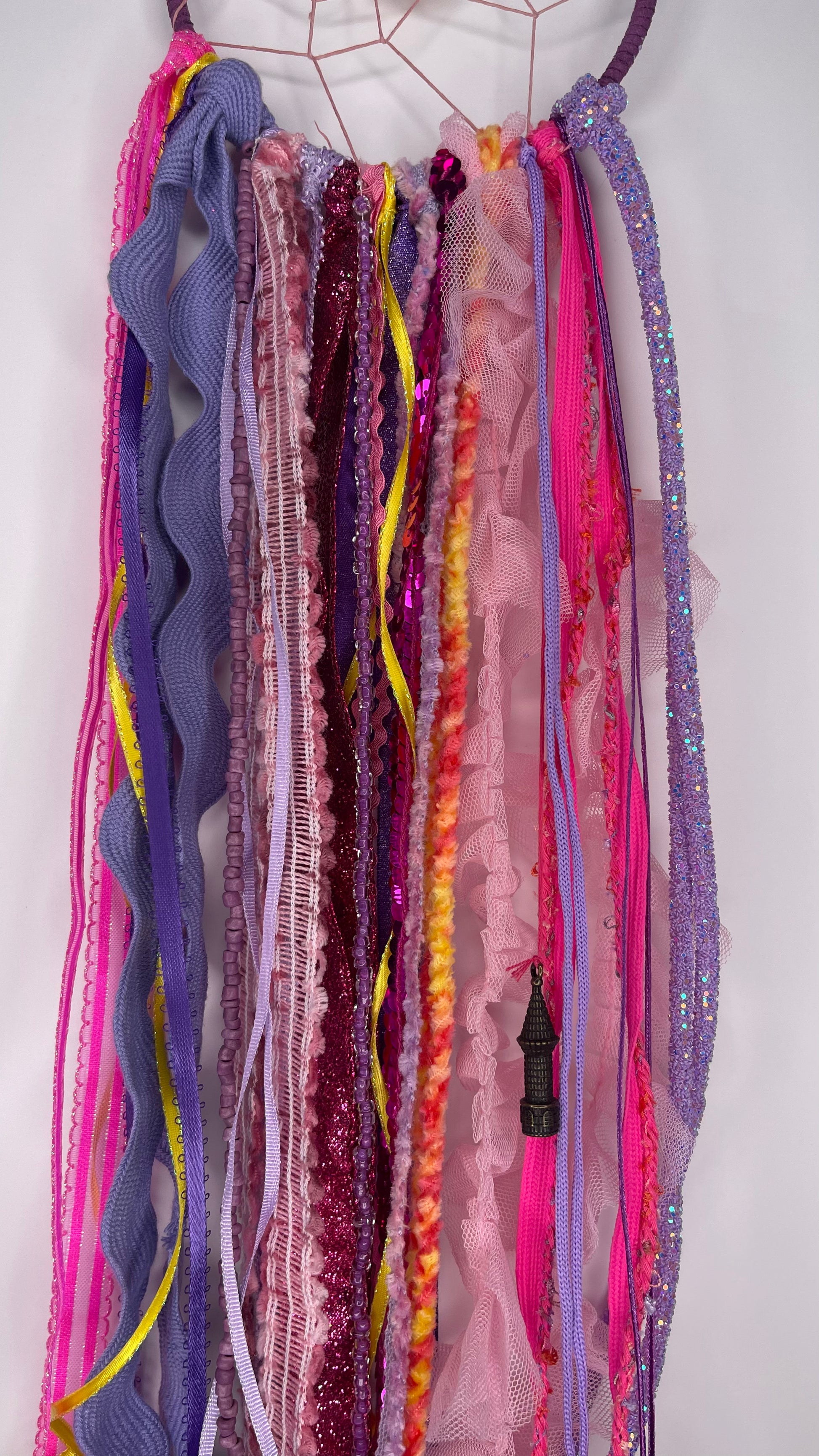 Let your imagination shine with this Tangled-inspired dreamcatcher. Soft lavender, blush pink, and golden ribbons flow like Rapunzel’s magical hair, accented with floral details that echo the lantern-lit sky. Each ribbon is chosen and placed with intention, creating an artisan heirloom that celebrates creativity, freedom, and the magic of following your dreams.